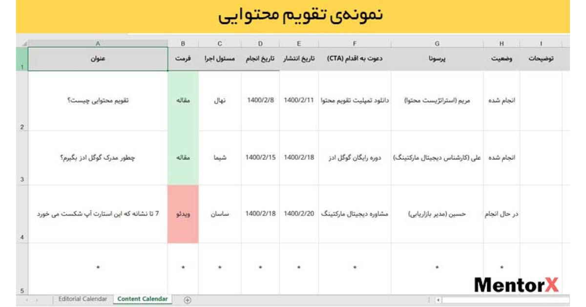 تصویری از نمونه تقویم محتوا در وبسایت منتوریکس که در گوگل شیت نوشته شده